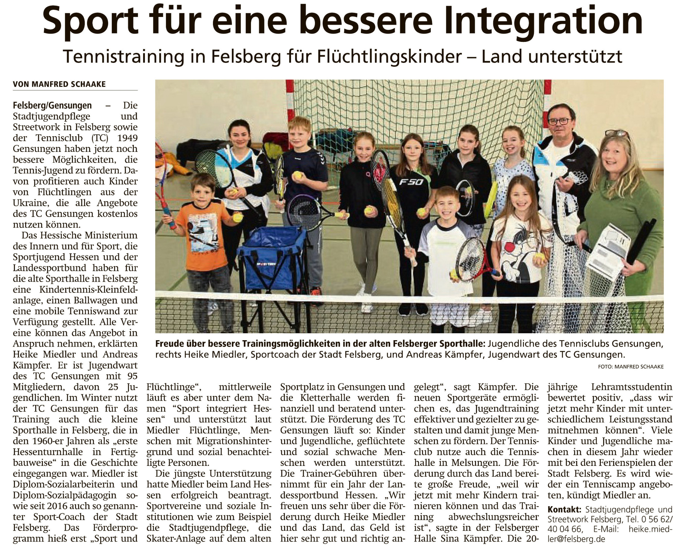 Seit Beginn des Jahres nehmen Kinder ukrainischer Flüchtlinge am Jugendtennistraining des TC Gensungen teil. Sowohl beim Hallentraining im Winter, wie auch beim Sommertraining auf der Anlage des Clubs haben mehrere Kinder und Jugendliche von dem kostenfreien Angebot Gebrauch gemacht.